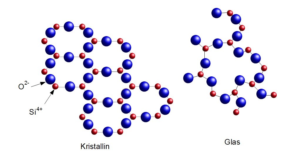 Die nachfolgende Abbildung sollen Ihnen dies anhand von Siliziumdioxid in kristalliner und glasartiger Struktur verdeutlichen.