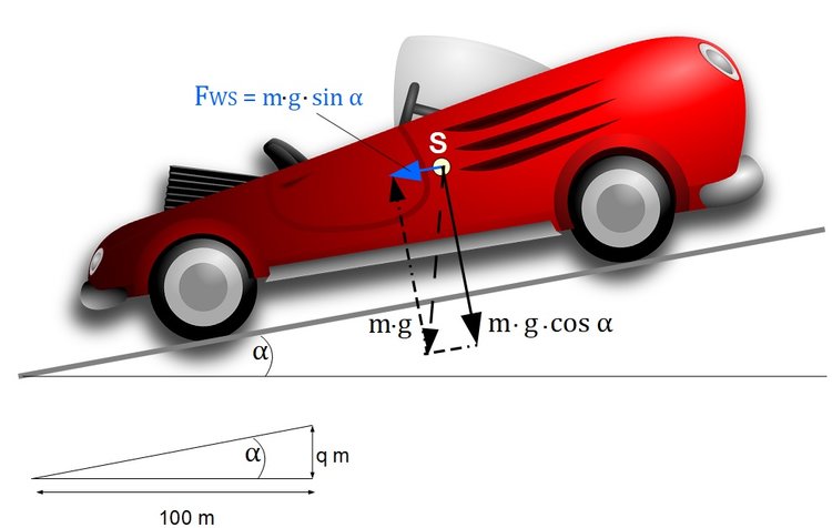 Uns interessiert besonders die Komponente parallel zur Fahrbahn, denn sie gibt uns den Steigungswiderstand vor: