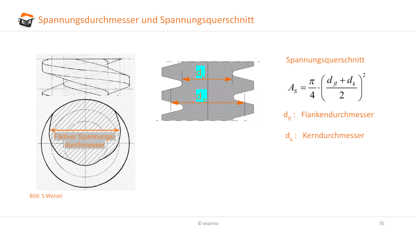 Der Spannungsquerschnitt errechnet sich mit Hilfe des Spannungsdurchmessers $ d_s $, der sich aus dem Mittelwert von Kerndurchmesser $ d_k $ und dem Flankendurchmesser $ d_{fl} $ errechnet.