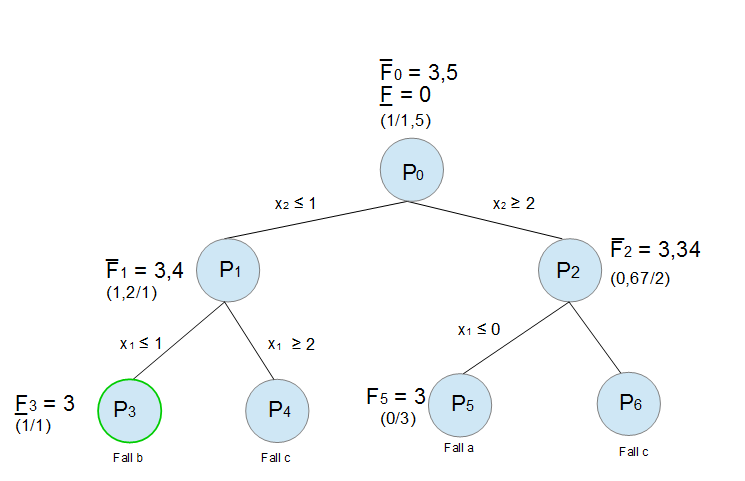 In der obigen Grafik sind nun die beiden Teilprobleme veranschaulicht. Zur Bestimmung der oberen Schranke für $P_5$ wurde als zusätzliche Restriktion $x_1 \le 0$ eingefügt. Die Restriktion $x_2 \ge 2$ für $P_2$ musste dabei erhalten bleiben. Es ergibt sich also der Bereich auf der $y$-Achse ($x_1 = 0$) und oberhalb von $x_2 = 2$, aber unterhalb der grünen Restriktion. Es ergibt sich demnach der Punkt $(0/3)$, welcher gerade noch im zulässigen Bereich liegt. Damit ergibt sich eine ganzzahlige Lösung, die oberhalb der untersten Schranke $\underline{F} = 0$ liegt. Es handelt sich hierbei allerdings um den Fall a, da die untere Schranke $\underline{F}_3 = 3$ bereits größer/gleich diesem Wert ist.