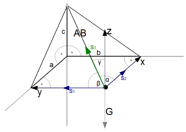 Im obigen Kräfteplan wurden die drei Dimensionen $x, \; y $ und $z$ hinzugefügt sowie die Winkel $\alpha$, $\beta$ und $\gamma$.