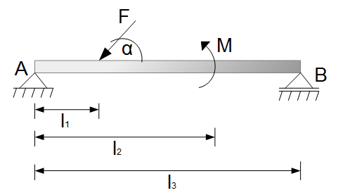 Gegeben sei der obige Balken, der durch die Kraft $F = 20N$ mit $\alpha = 50°$ und durch das Moment $M = 40 Nm$ belastet ist. Die Abstände seien $l_1 = 5m$, $l_2 = 12m$ und $l_3 = 16m$. Bestimmen Sie die Schnittgrößenbereiche und geben Sie diese mit der Föppl-Klammer an.